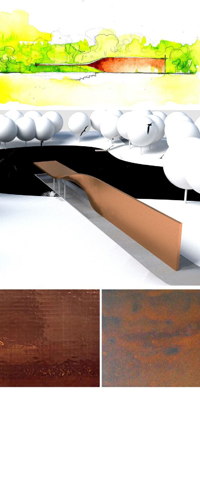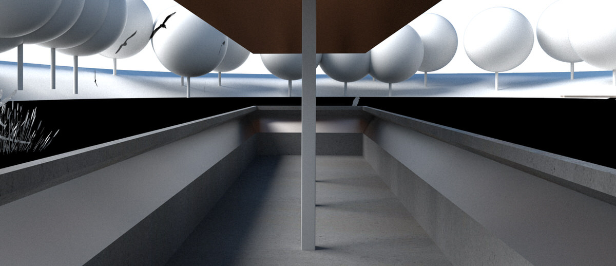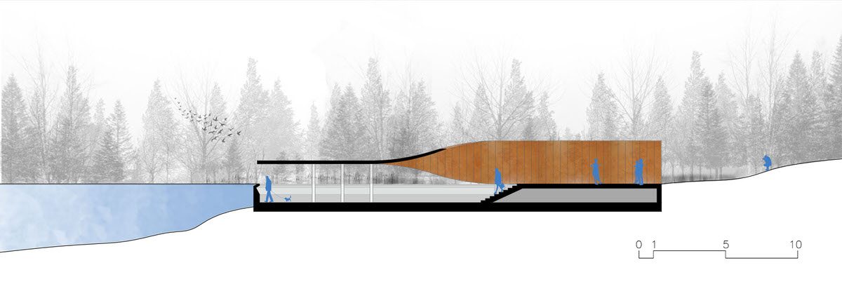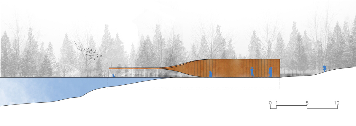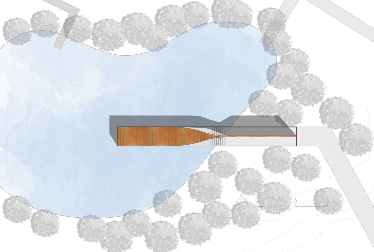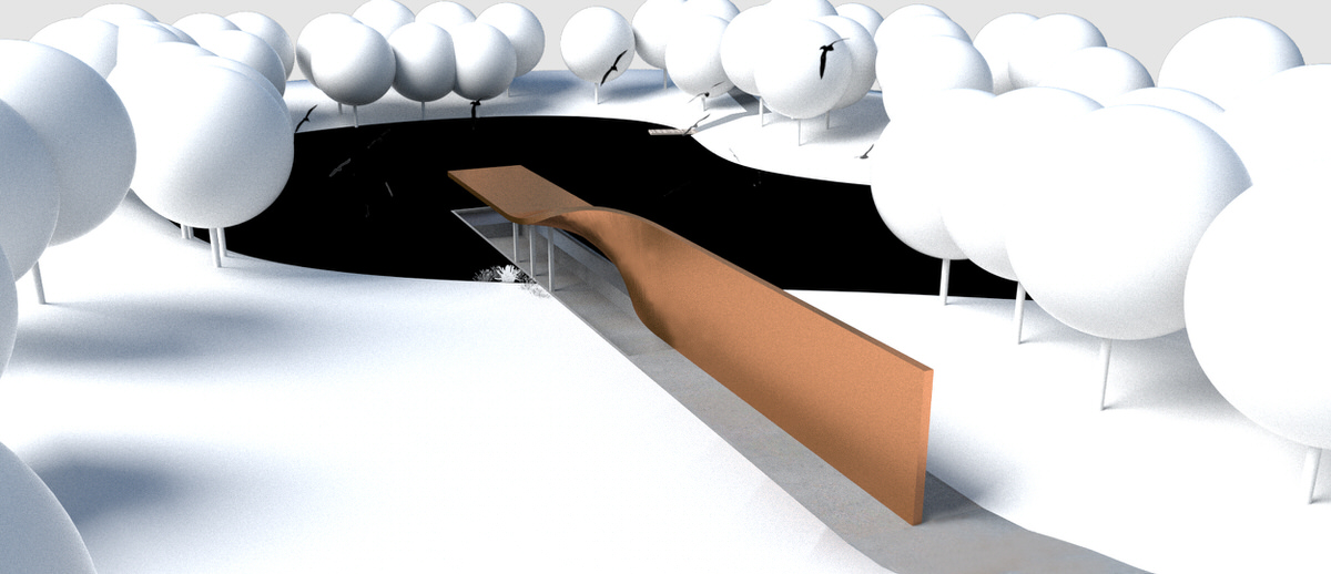 The bird pavilion is located on a small island deeply embedded in ecodistrict in North of the park. On the island there is a little pond whose original ecological system provides a nice dwelling for birds. The gallery extends from woods towards waterfront. With a sudden twist, a wall is changed to a roof. Visitors coming from woods step down along the science wall and enter the bird pavilion upon water surface. Having an almost parallel view with the water surface, visitors could watch birds and enjoy the quietness here. With a wall engraved with sketches and information about birds and board series along the waterfront, this bird pavilion of 80 m² brings recreation, education and bird watching in a nutshell. The sculptural gallery is more like a piece of art embedded in the landscape. Elegantly curved surface symbolizes aerodynamics, which explains the secret of flying.