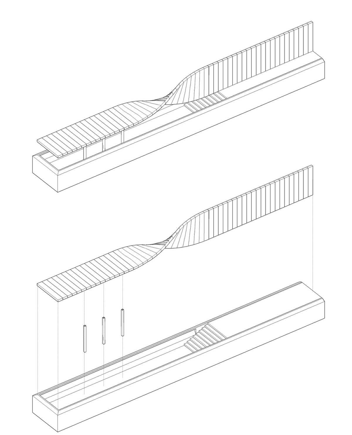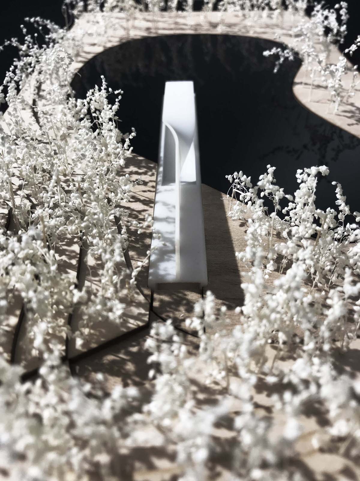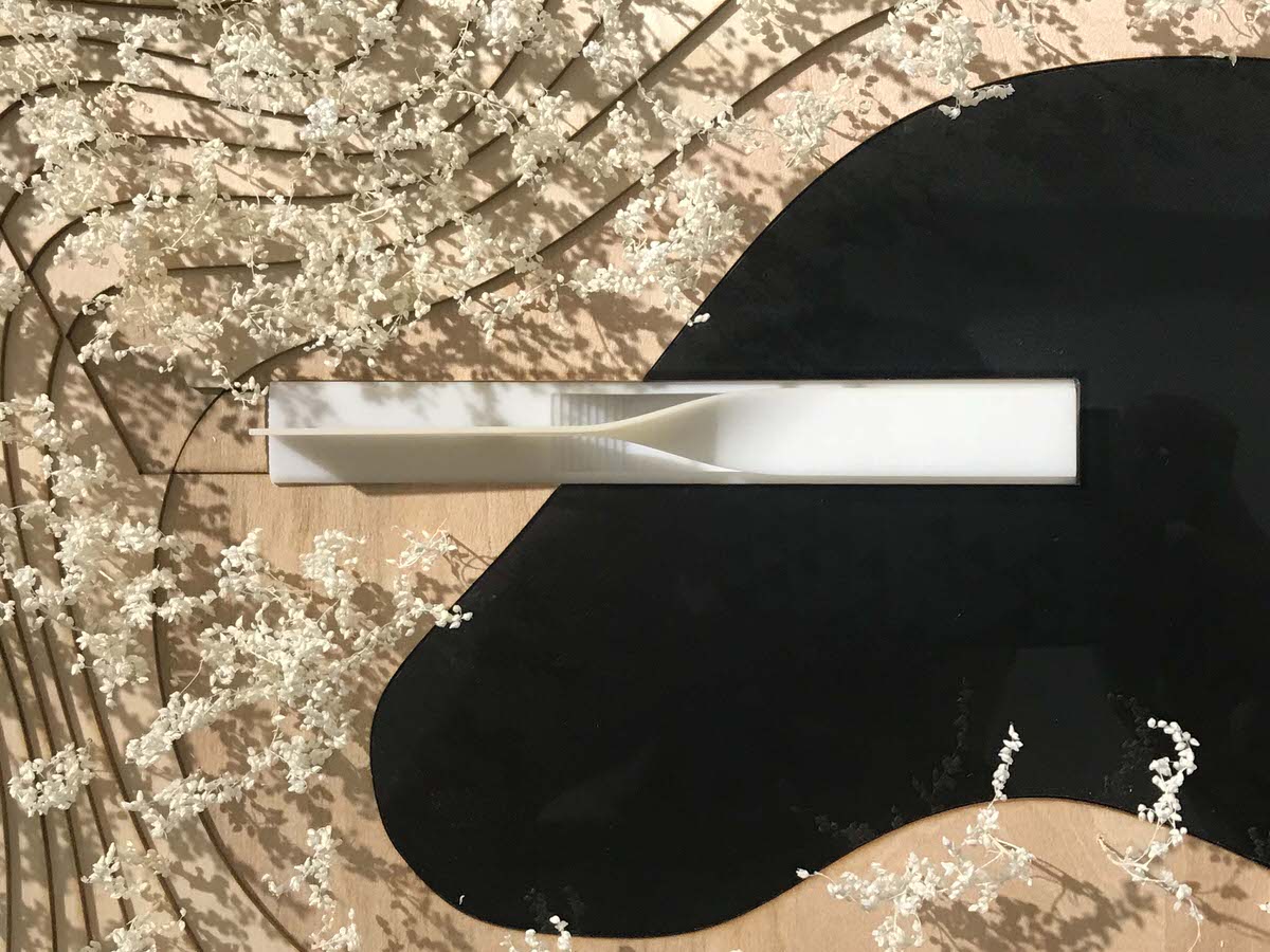 The bird pavilion is located on a small island deeply embedded in ecodistrict in North of the park. On the island there is a little pond whose original ecological system provides a nice dwelling for birds. The gallery extends from woods towards waterfront. With a sudden twist, a wall is changed to a roof. Visitors coming from woods step down along the science wall and enter the bird pavilion upon water surface. Having an almost parallel view with the water surface, visitors could watch birds and enjoy the quietness here. With a wall engraved with sketches and information about birds and board series along the waterfront, this bird pavilion of 80 m² brings recreation, education and bird watching in a nutshell. The sculptural gallery is more like a piece of art embedded in the landscape. Elegantly curved surface symbolizes aerodynamics, which explains the secret of flying.