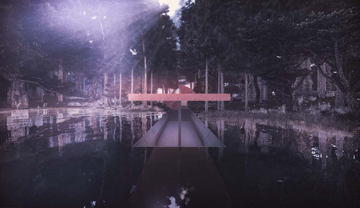 The red copper cladding reflects light, creating an interesting dialogue with its surrounding woods and water surface. The interaction is incredible yet unquestionable. The surface of the red copper will be oxidized over time, changing its appearance constantly, which proves the essence of human-nature interaction.