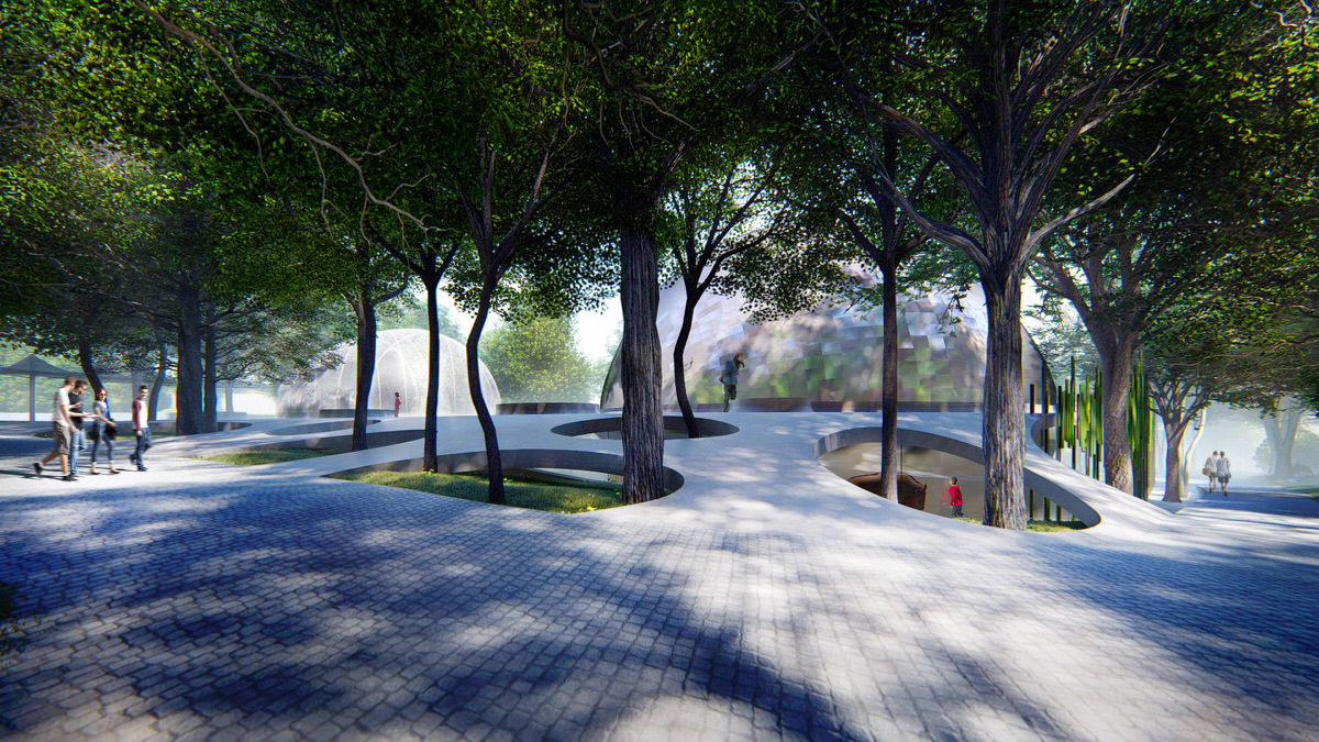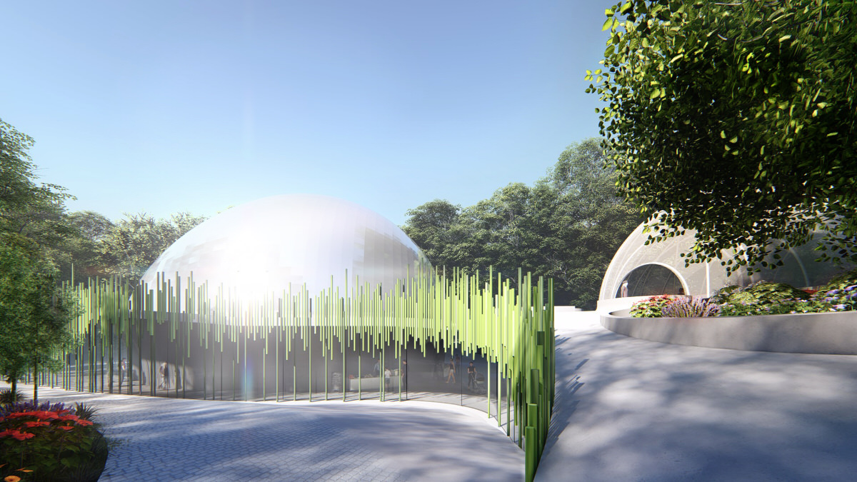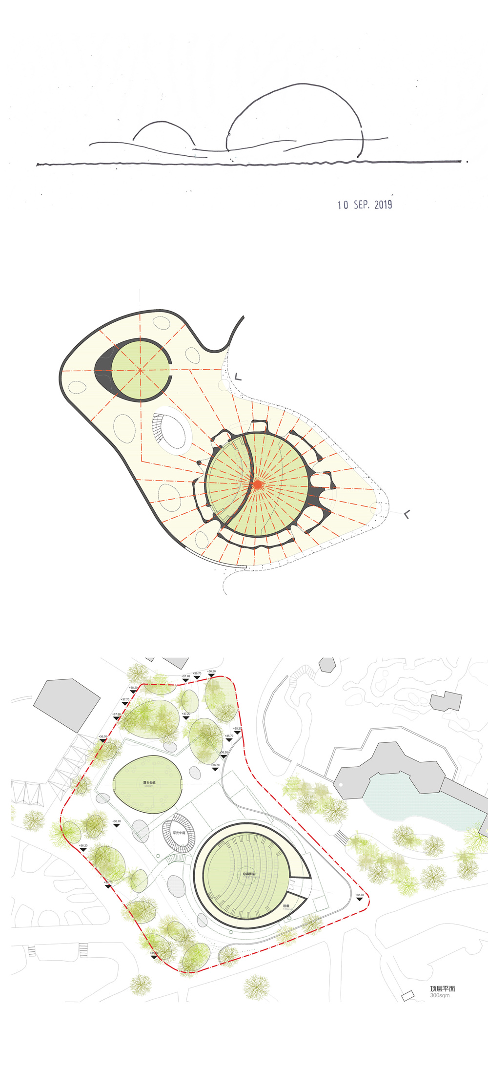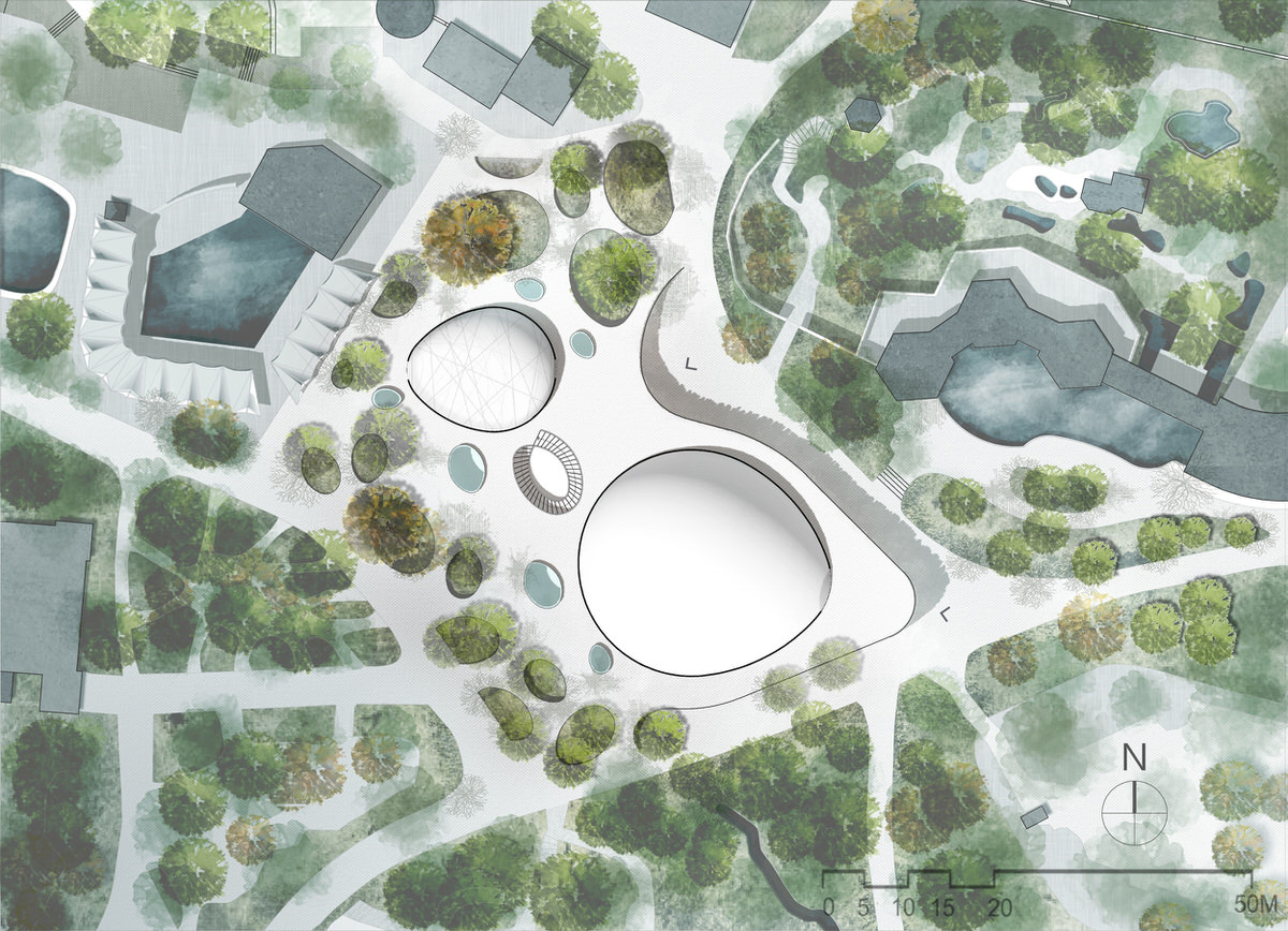 Hangzhou Zoo is a public park at the heart of West Lake Scenic District. It situates in a hilly region south of West Lake. The peaks and troughs of the hills covered by dense vegetation and scattered animal exhibits cohere the zoo’s famous landscape. As the conservation awareness grew, the old “animal circus theatre” will be suspended. In its place, the zoo management team wish to provide, to the millions of annual visitors, innovative edutainment experiences themed around animal conservation, through new media exhibition and performances. As a result, the key deliverables are a dome theatre and a promenade exhibition hall.