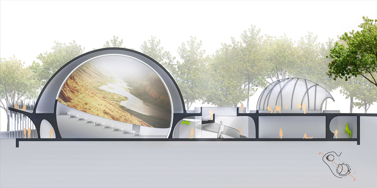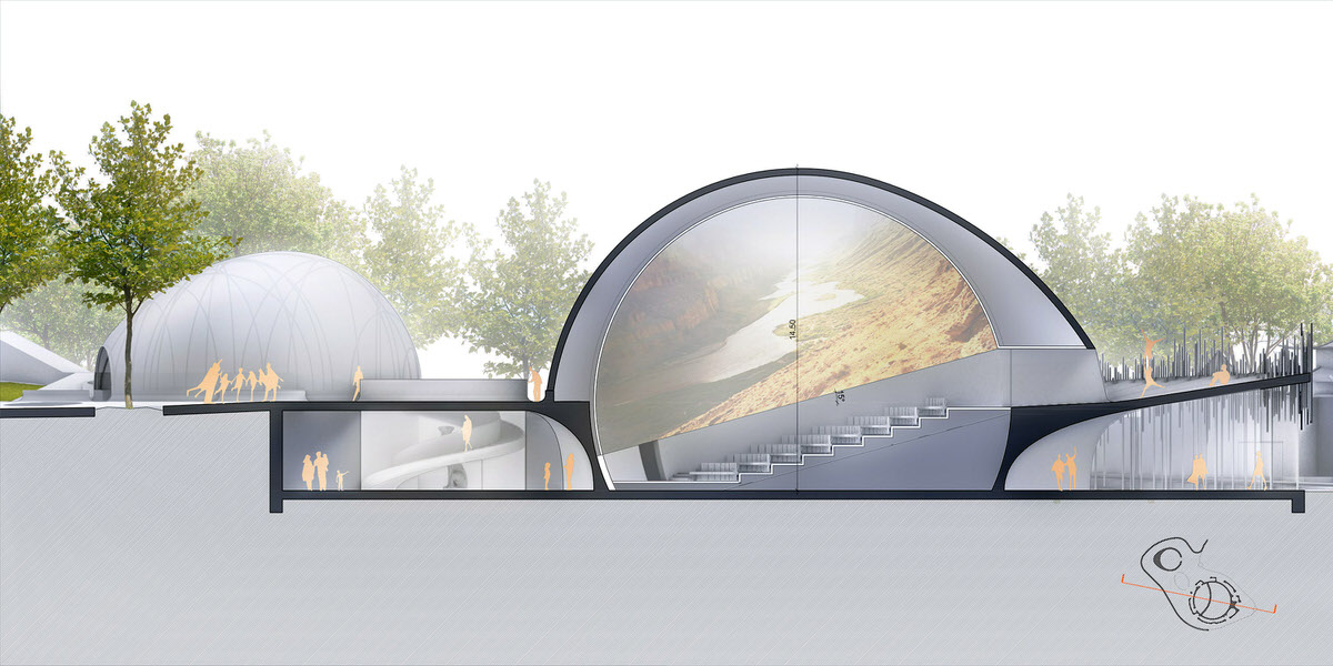 The plan utilized dome theatre’s unique structure, morphed it into an egg shape to coincide with its natural conservation theme. It also used the hilly natural landscape and merged it intricately with the outdoor platform, dissolving the boundary between the architecture and the surrounding landscape. Visitors could suddenly find themselves entering into the newly built Dome theatre and Promenade exhibition from any directions and routes. This Openness and Publicness infused into the architecture is an adequate strategy to cohere with the surrounding landscape. Furthermore, it is an effective means for enriching visitors’ touring experience.