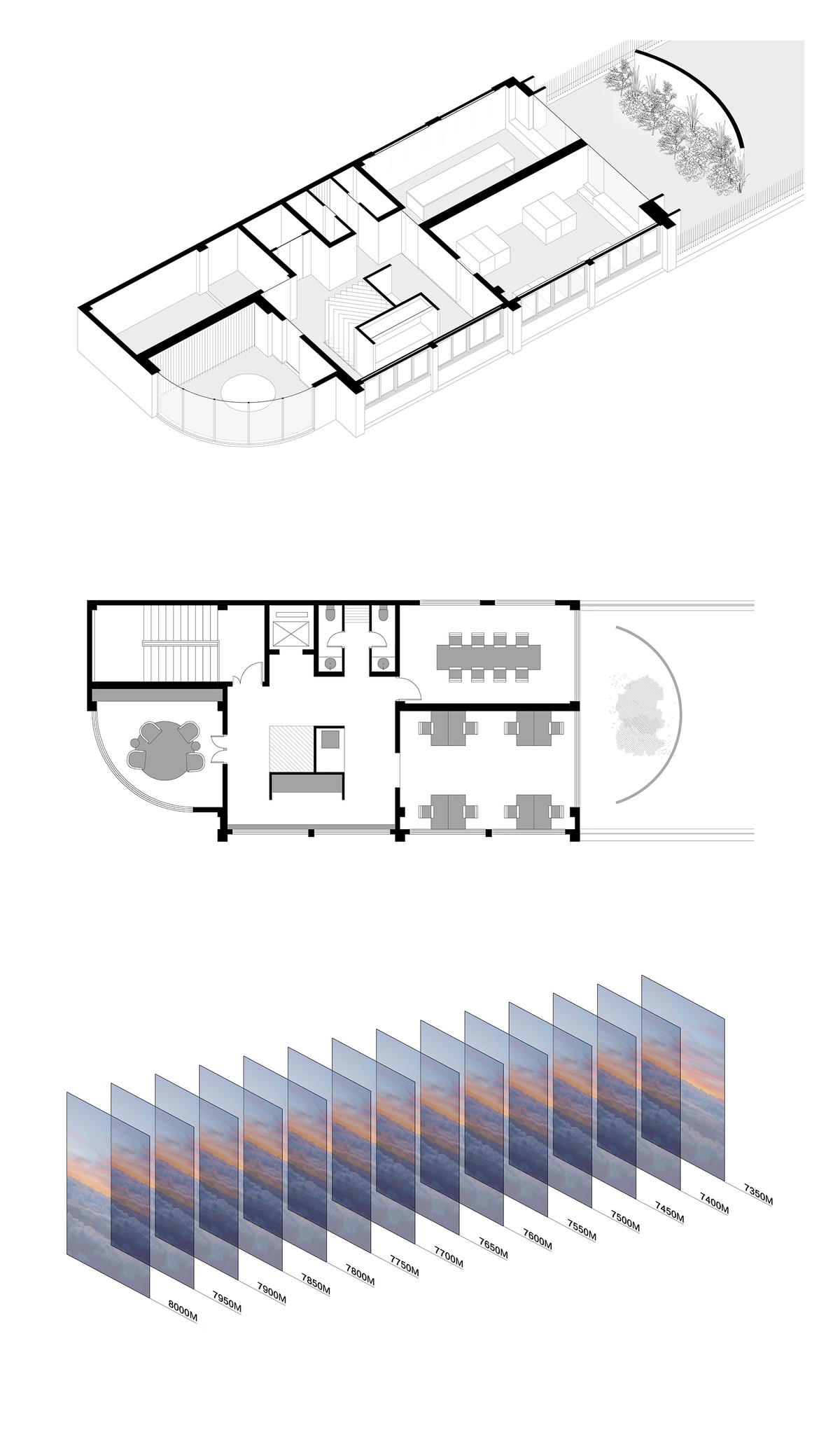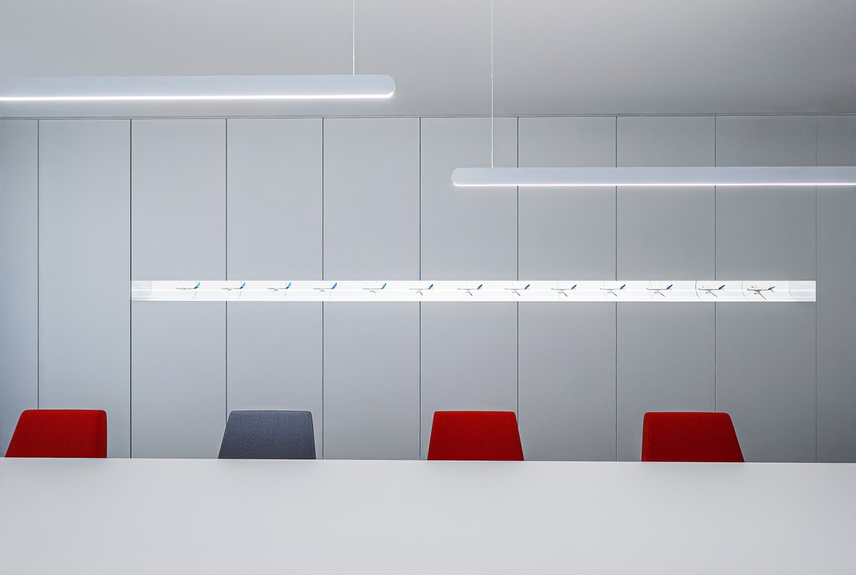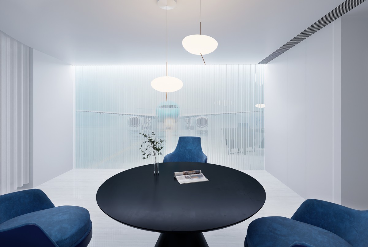 The juxtaposition of art and function within the reception office of LoongAir Travel Agency mirrors the coexistence of abstract feelings and pragmatic plans experienced during travel. The objective is to create a space that balances an orderly and efficient office atmosphere with the abstract and poetic emotions evoked by the art installation.