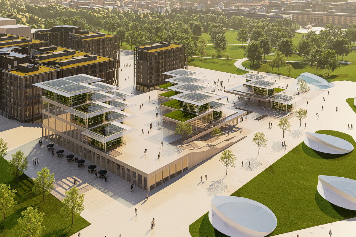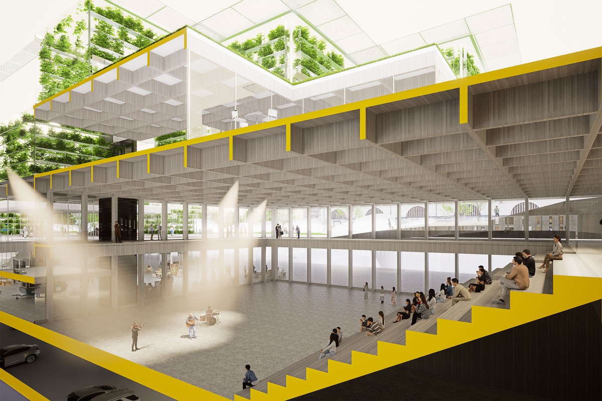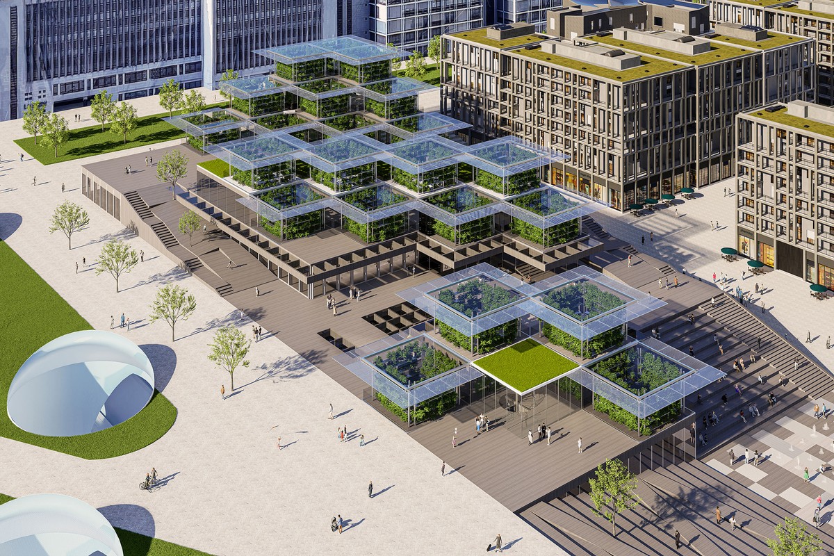 This vast "green valley" consists of terraced gardens and greenhouses, harmoniously integrated into the surrounding landscape. The interior of the building is an open, flowing space that connects people in all directions. There are entrances on various levels to the train station, public squares, and subway station. This creates a vibrant community for both residents and visitors, with markets, reading corners, exhibitions, performances, and family areas. The entire complex is constructed from sustainable wood and offers flexible, open spaces.