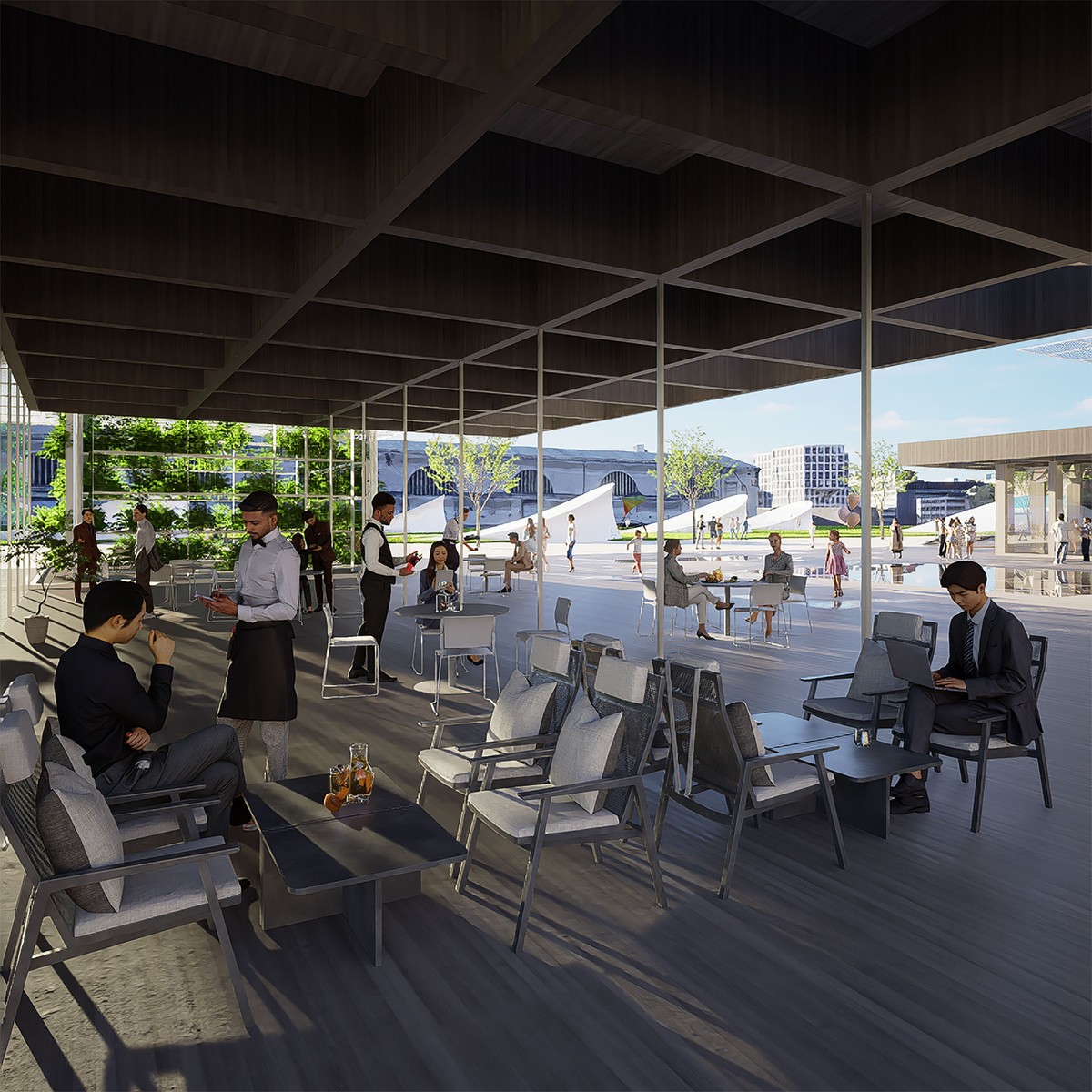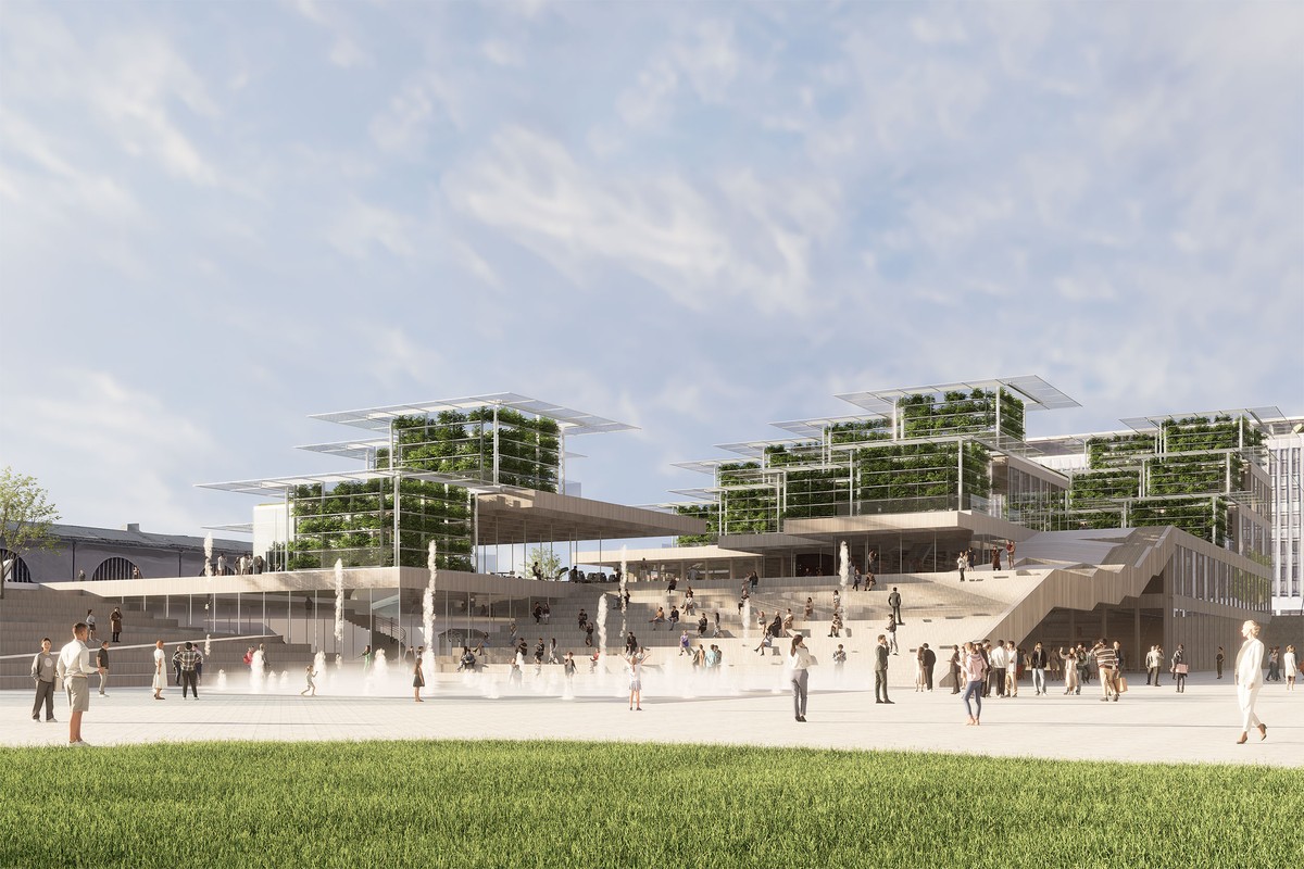 The terraced gardens and greenhouses will be managed by the citizens themselves. These green oases offer flexible work and learning spaces, meeting the modern need for mobile working environments. In good weather, events can be held on the rooftops, and the open spaces invite people to linger. Inside, there are open floors with areas for reading, learning, working, playing, relaxing, and childcare facilities. The internal marketplace focuses on culinary experiences, offering a food lab, food trucks, and stalls with coffee and other delicacies. A flexible black-box theater can be converted into a sports hall or exhibition space. The large staircase to the south serves as an open-air theater, where performances can be enjoyed, and the fountain square becomes a paradise for children in the summer.