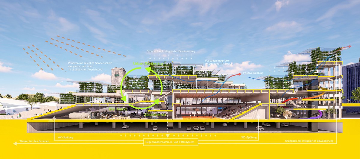 We want to reshape neighborhood relationships. Fruits and vegetables from the roof will be processed locally and offered to visitors. Rainwater and kitchen waste will be recycled. Food, as a universal language, brings people from different regions and cultures together. Creative restaurants and food stalls cater to both travelers and locals. Regular events like the "Rosenstein International Food Festival" and the "Rosenstein Market Art Season" showcase the diversity and inclusivity of Stuttgart.