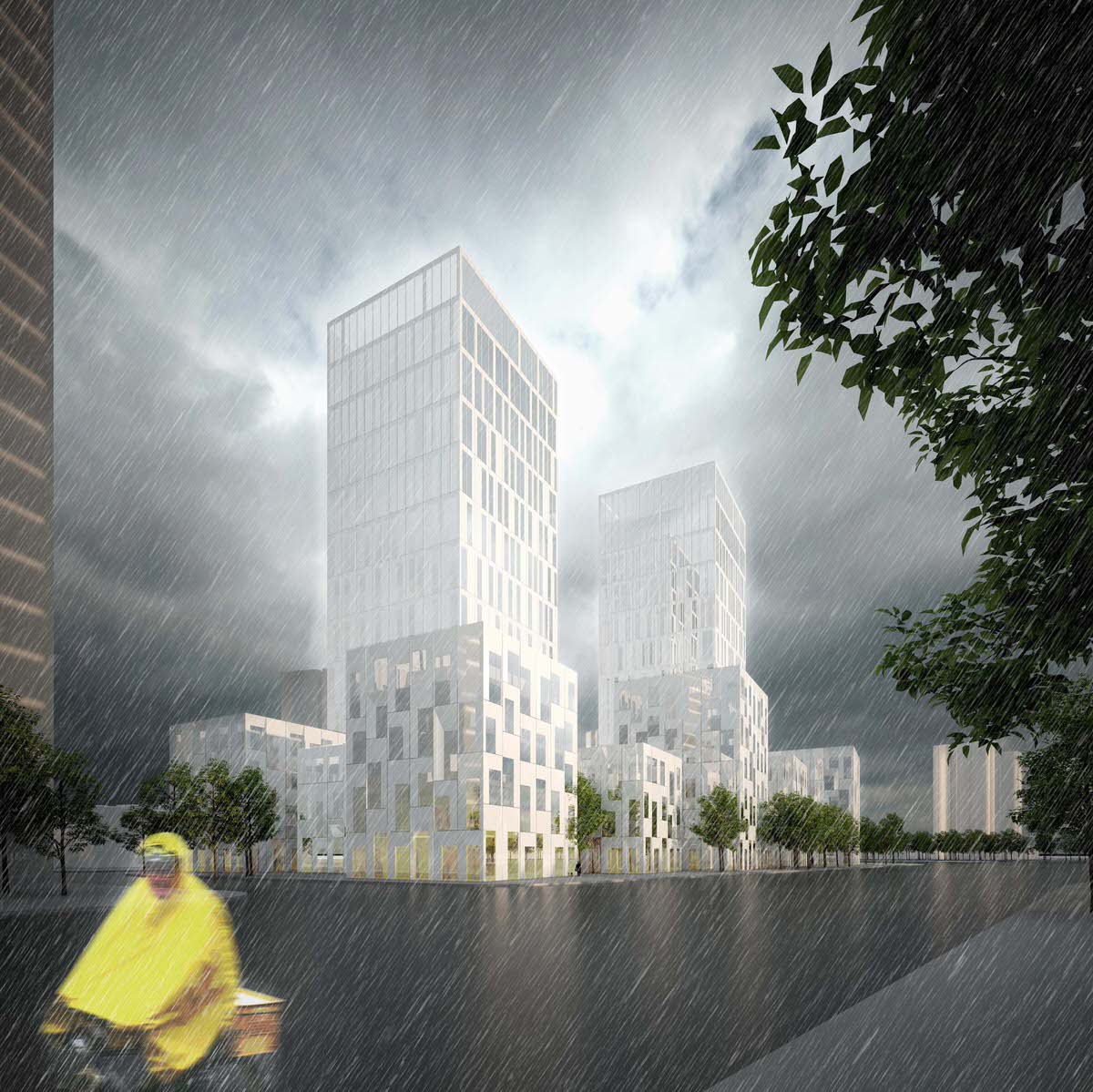 The layout is consisted of cubes with different sizes, between which many small lanes convenient for pedestrian flows come into being, adding more frontage space for retail. In the middle of the site there is a large sunken-plaza functioning as metro access. This sunken-plaza would not only reduce the stress of pedestrian flow on the main road, but also vitalize the commercial complex, bringing more business opportunities. The upper floors of the commercial podium are connected with passages, with which two high-rise office buildings are also linked. Seen from the urban interface, instead of a closed frontage the building complexes open up and whet the curiosity of pedestrians to drop in.